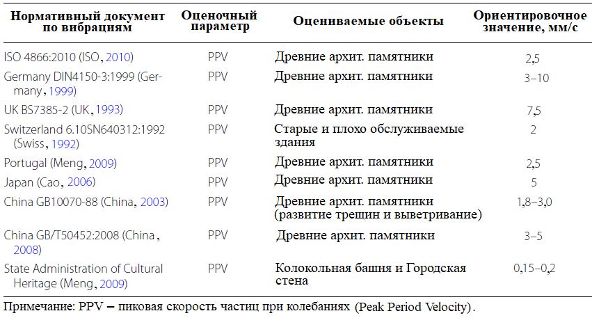 Чтобы исследовать воздействие вибраций на архитектурные памятники, в этой статье были обобщены сведения о нормативно допустимых параметрах такого влияния.