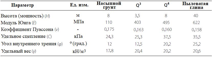 Таблица 3. Параметры грунтов основания Колокольной башни для численной модели