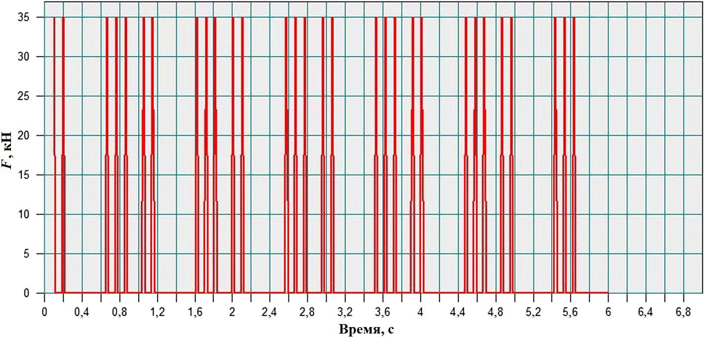 Рис. 7. Динамические нагрузки от поезда, движущегося со скоростью 80 км/ч (по результатам работы в программе midas GTS NX