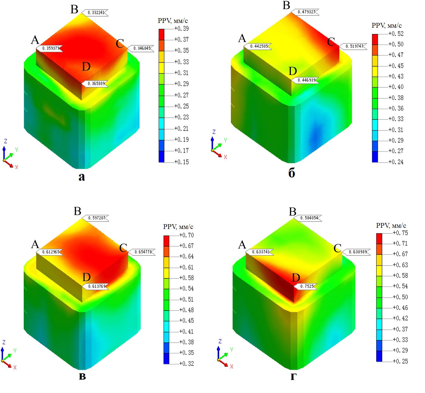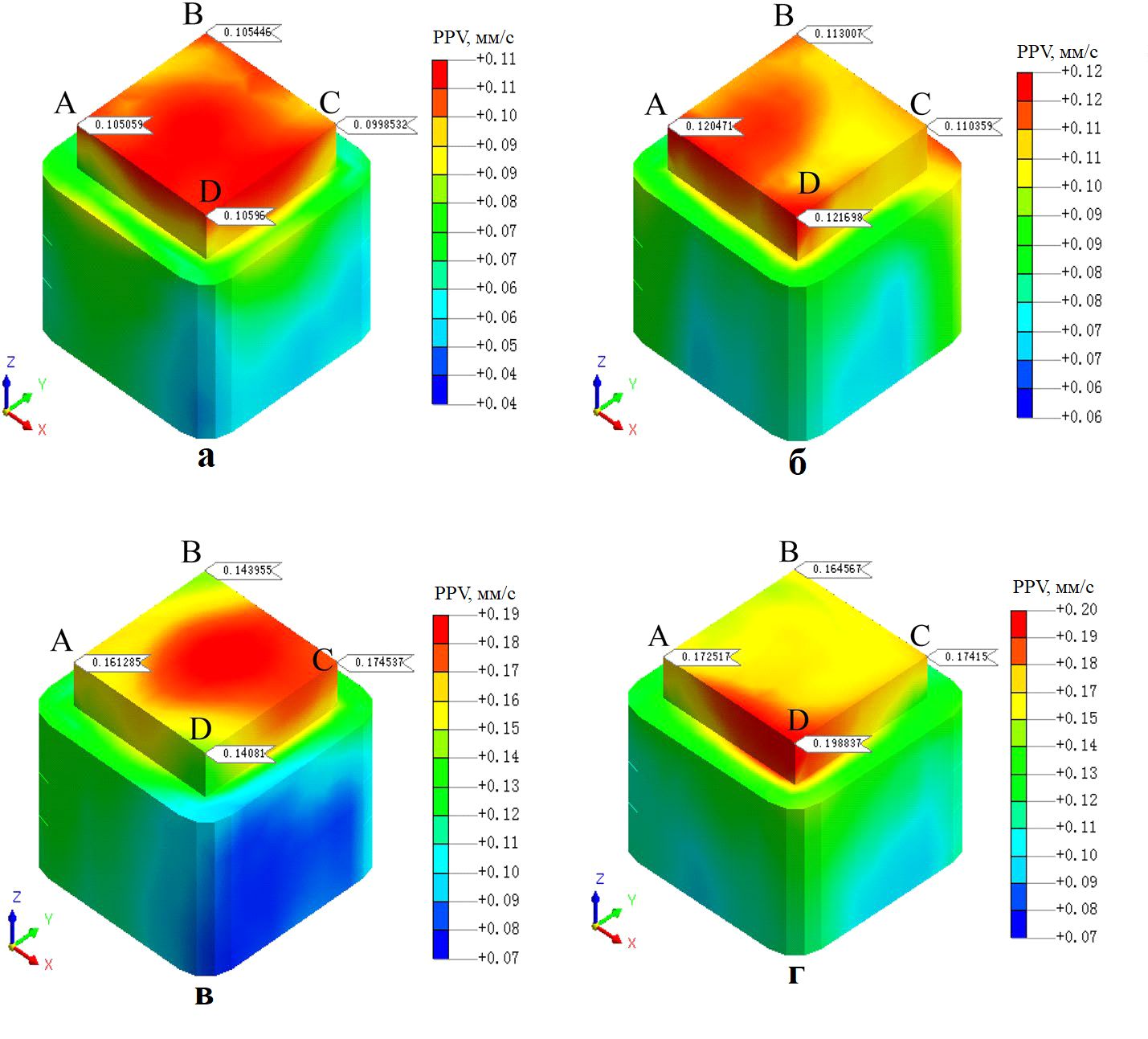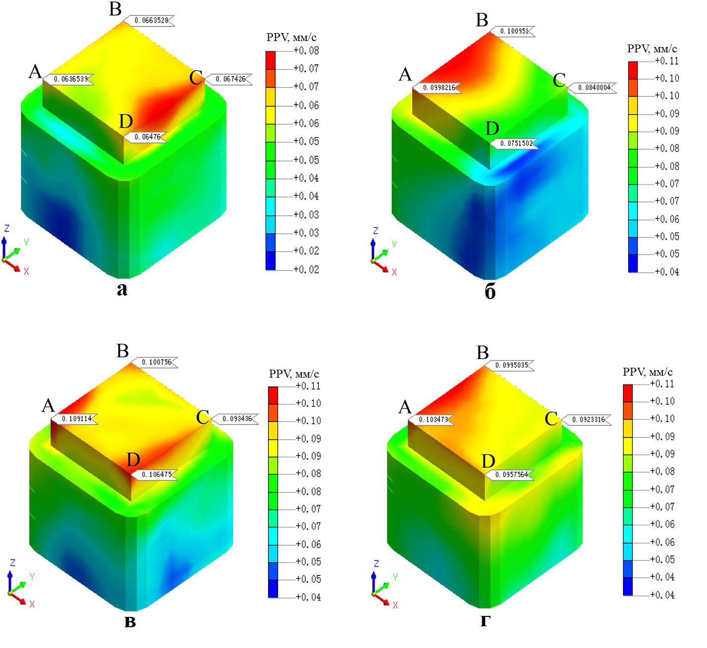 Сопоставление величин PPV при отсутствии (для наборов условий 1–3, см. таблицу 2) и при наличии (для наборов условий 4–6, см. таблицу 2) амортизирующих путей при прочих равных условиях представлено в таблицах 7–9. Видно, что при наличии демпфирующих путей значения PPV во всех выбранных угловых точках цоколя (A, B, C, D) существенно ниже.