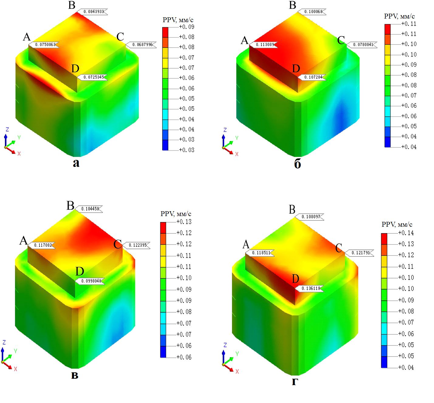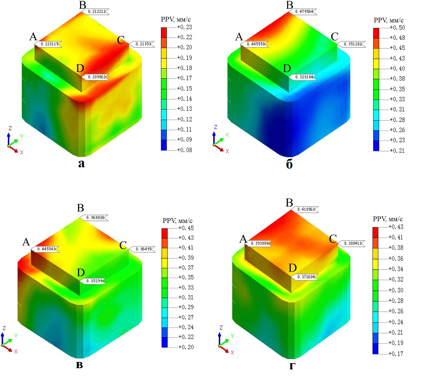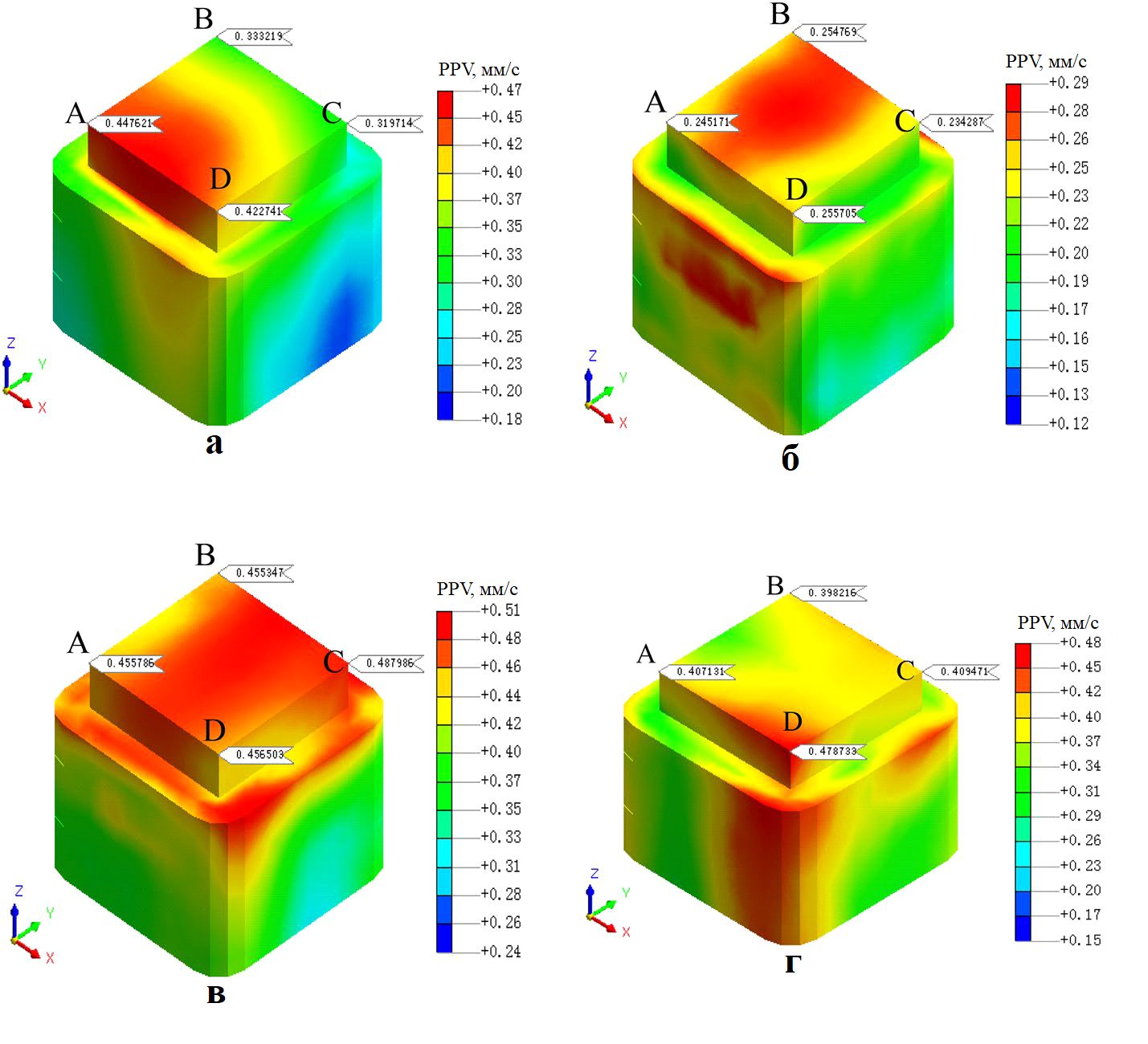 Сопоставление величин PPV при отсутствии (для наборов условий 1–3, см. таблицу 2) и при наличии (для наборов условий 4–6, см. таблицу 2) амортизирующих путей при прочих равных условиях представлено в таблицах 7–9. Видно, что при наличии демпфирующих путей значения PPV во всех выбранных угловых точках цоколя (A, B, C, D) существенно ниже.