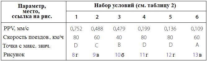 Таблица 5. Максимальные значения PPV (из четырех угловых точек цоколя башни) для шести наборов условий при разной скорости поездов