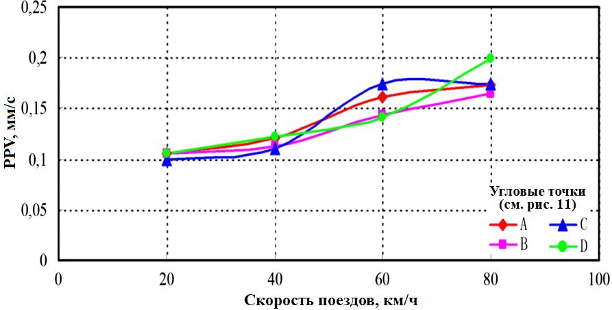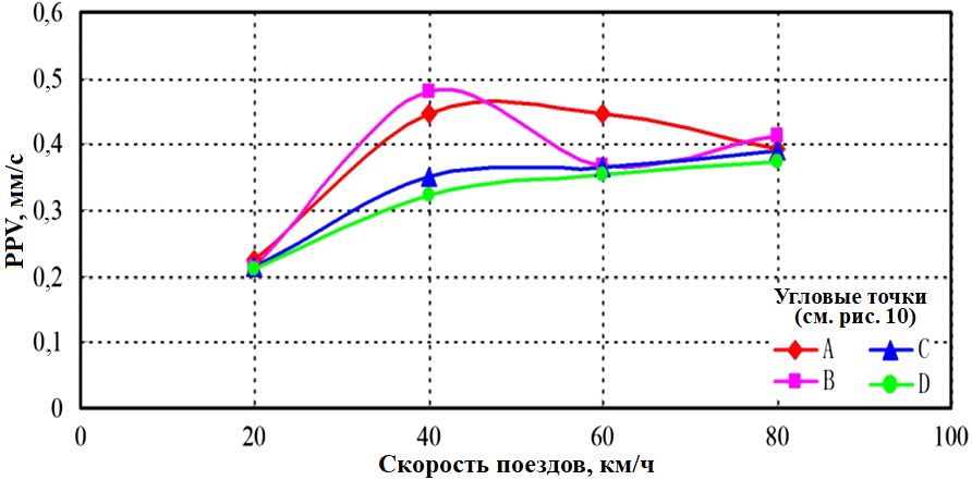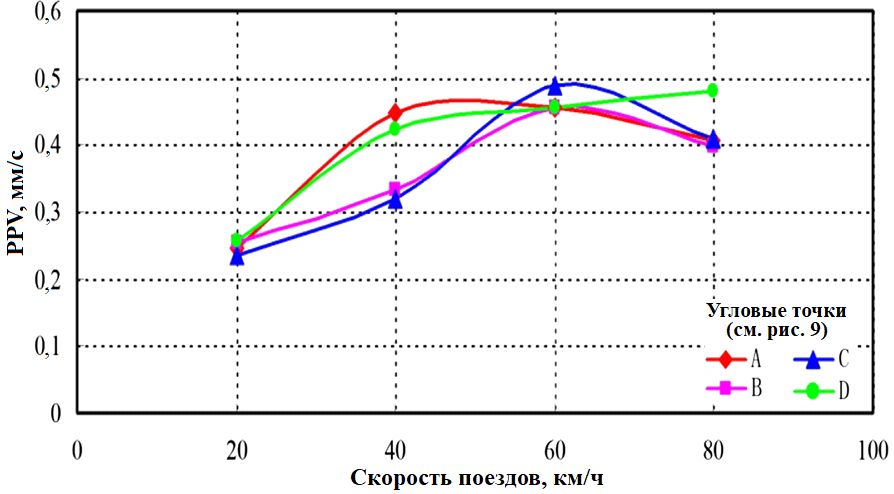 Рис. 19. Зависимости PPV в четырех выбранных угловых точках цоколя (A, B, C, D) от скорости движения поездов для набора условий 6 (см. таблицу 2)