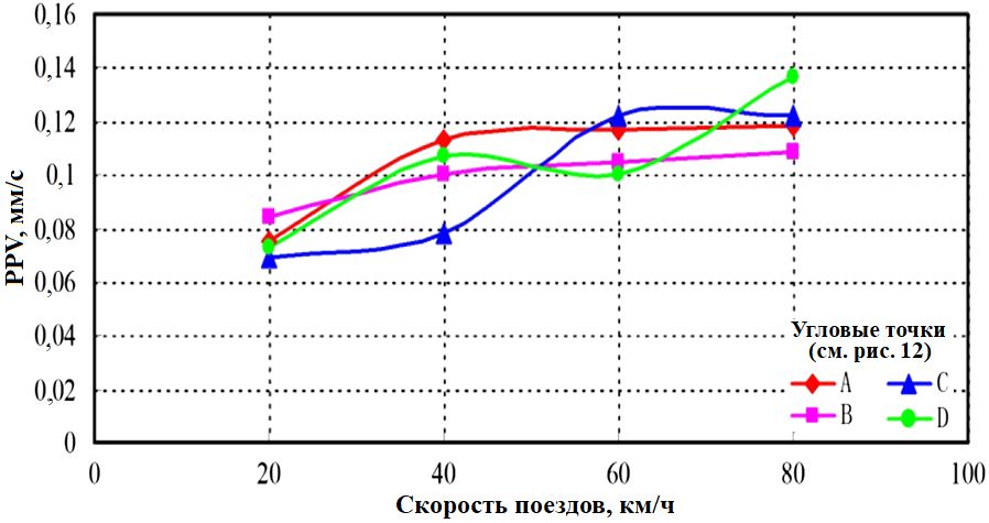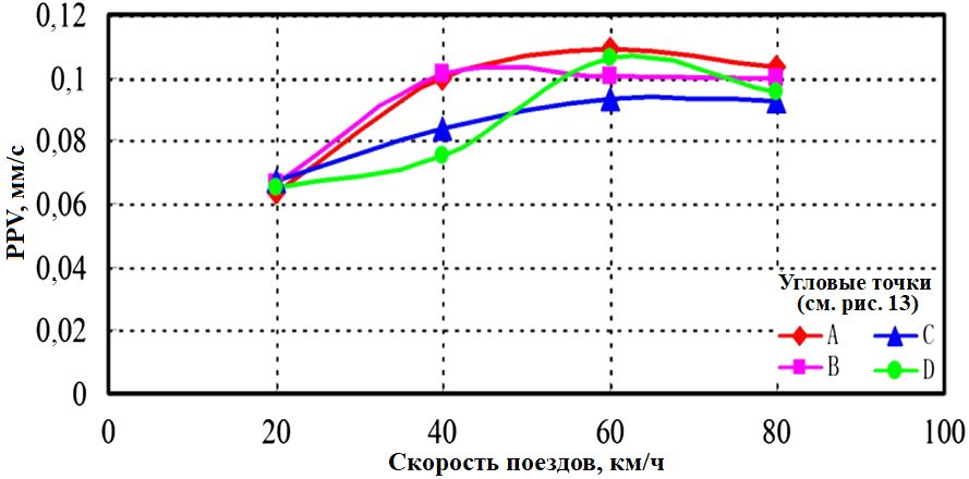 Рис. 16. Зависимости PPV в четырех выбранных угловых точках цоколя (A, B, C, D) от скорости движения поездов для набора условий 3 (см. таблицу 2)