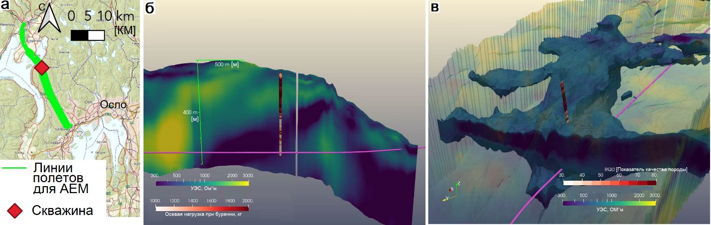 Рис. 1. Зона более слабых, более трещиноватых грунтов, обнаруженная с помощью AEM с последующим подтверждением данными бурения с отбором образцов керна: а – зона исследований методом AEM и пример расположения инженерно-геологической скважины на карте; б – вертикальный геоэлектрический разрез и геологическая колонка скважины; в – трехмерное наклонное изображение зоны с низким УЭС. Трасса тоннеля показана ярким розово-пурпурным цветом (цветом фуксии). Использовано 3-кратное вертикальное увеличение