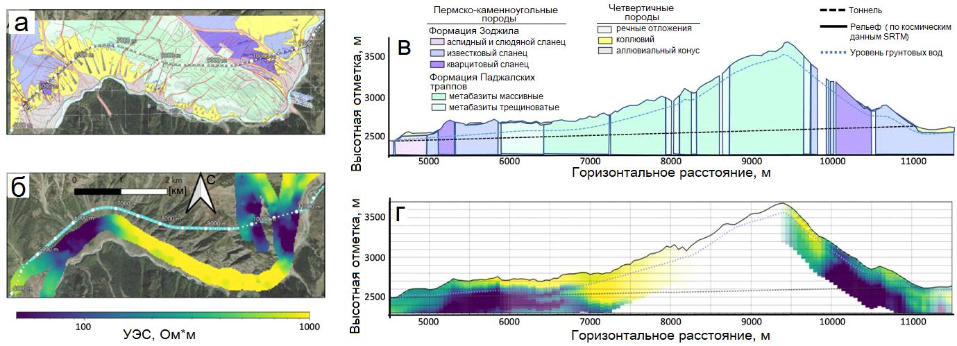 Рис. 2. Геологическая карта рассматриваемой территории (по [10]) (а); горизонтальный срез модели УЭС, полученной методом AEM, по глубине 200 м от поверхности земли (б); геологический разрез вдоль трассы тоннеля (по [11]) (в); геоэлектрический разрез по той же линии (г)