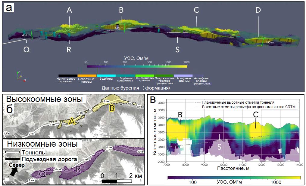 Рис. 3. 3D изображение геоэлектрической модели вдоль трассы тоннеля (показанной белой линией) с указанием высокоомных (A, B, C, D) и низкоомных (Q, R, S) зон со значениями УЭС более 1000 Ом*м и менее 100 Ом*м соответственно (а); карты с максимально протяженными высокоомными зонами A, B и низкоомной зоной R (б); вертикальный разрез геоэлектрической модели и планируемого тоннеля (в)