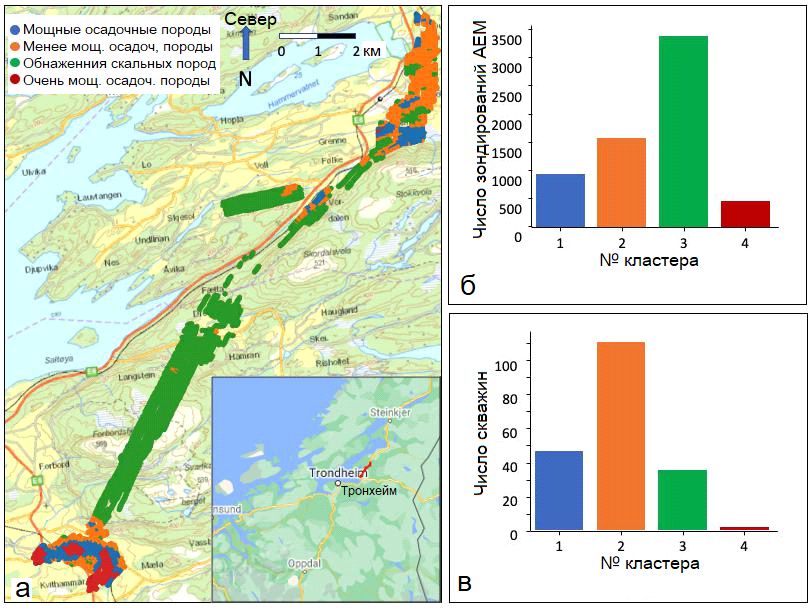 Рис. 4. Карта данных, разбитых на 4 кластера в соответствии со значениями УЭС (a); распределение по кластерам количеств зондирований методом AEM (б); распределение по кластерам количеств инженерно-геологических скважин, доступных для исследований в июне 2019 года (в)