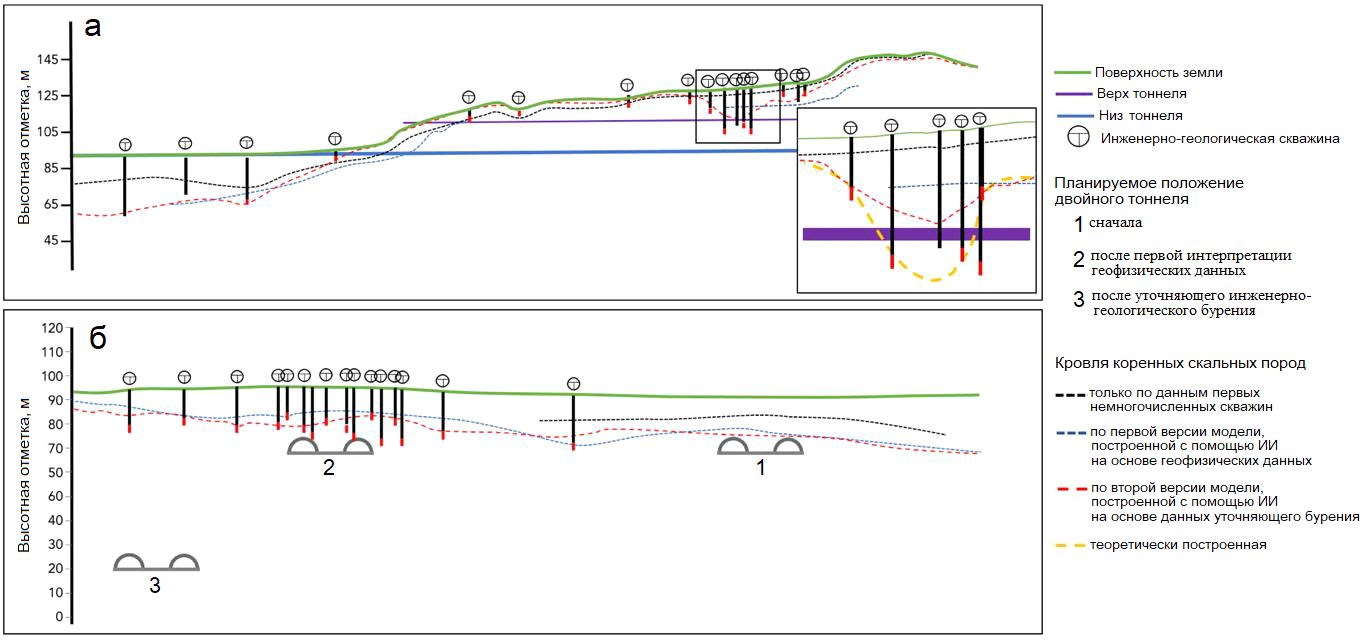 На втором из названных участков (см. рис. 5, б), толщина скального грунта над запланированным тоннелем согласно первой интерпретации геофизических данных была фактически нулевой, что побудило проектировщиков переместить трассу сооружения на несколько сотен метров западнее и сосредоточить последующее бурение инженерно-геологических скважин на новом месте. Но и обновленная модель показала наличие только 5 м скальных грунтов на некоторых участках перемещенной к западу трассы. Поэтому в конечном итоге трасса была опущена на 50 м вниз.