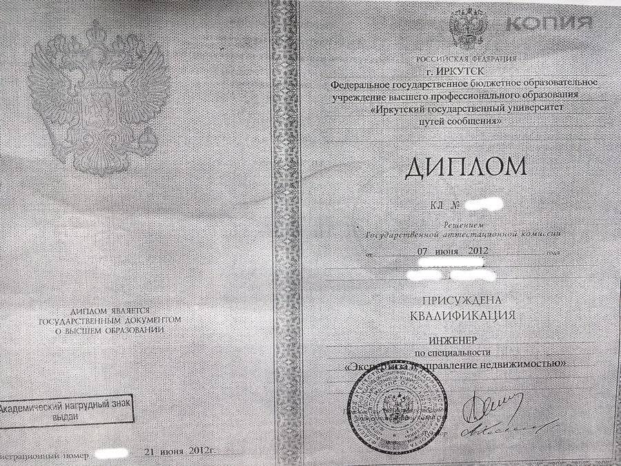 Диплом Инженера от 2012 года по специальности «Экспертиза и управление недвижимостью»