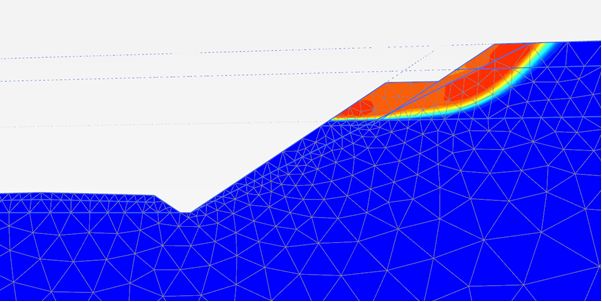 Таким образом, не всегда больший объем работ приводит к лучшим результатам. Изменение геометрии выемки должно опираться на расчеты. В нашем примере наибольшая устойчивость откоса выемки достигается тогда, когда уступ сооружается на высоте между двумя верхними слоями, то есть там, где находится поверхность скольжения. Определив положение последней в PLAXIS 2D, можно создать в OpenRoads Designer шаблон коридора с привязкой уступа к такой поверхности (поскольку ее высота непостоянна и меняется в разных сечениях).