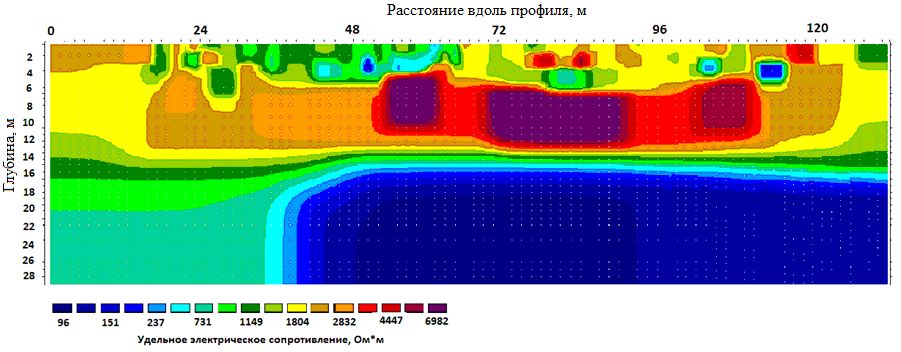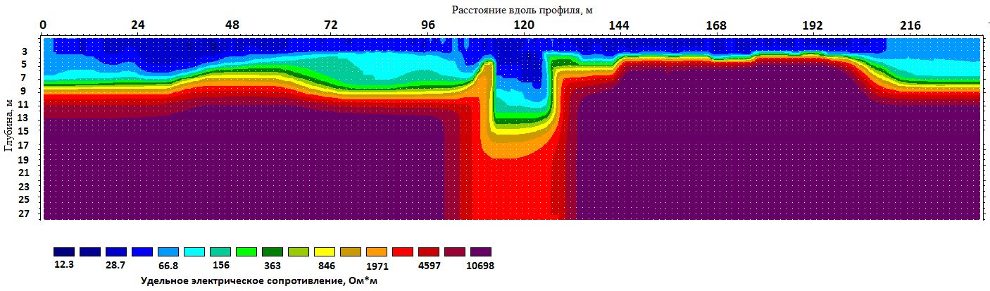 Геоэлектрический разрез отражает совокупность электрических и геометрических характеристик грунтов, слагающих исследуемую территорию. На таком разрезе обозначаются основные границы между грунтами, различающимися по своим электрическим свойствам.