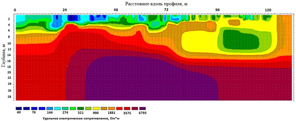 На рисунке 2 видно, что многолетнемерзлые грунты слагают сравнительно маломощный горизонт в интервале глубины 6–12 м. Ниже этого горизонта находятся грунты в талом состоянии, причем на псевдо-геоэлектрическом разрезе хорошо прослеживается граница между суглинками и супесями в районе пикета ПК 36 (36 м). Полученные геофизические данные дали основание довести часть разведочных скважин с проектных глубин 7–10 м до входа их забоев в талые грунты.
