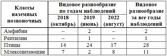 Общие сведения о видовом разнообразии наземных позвоночных, отмеченном в разные годы наблюдений на маршрутах и в результате отловов ловушками «Геро», приведены в таблице 1.