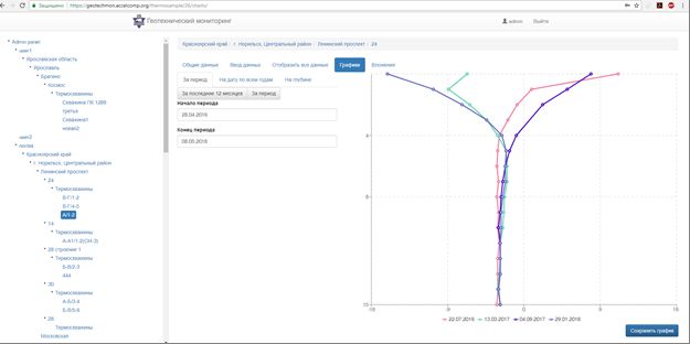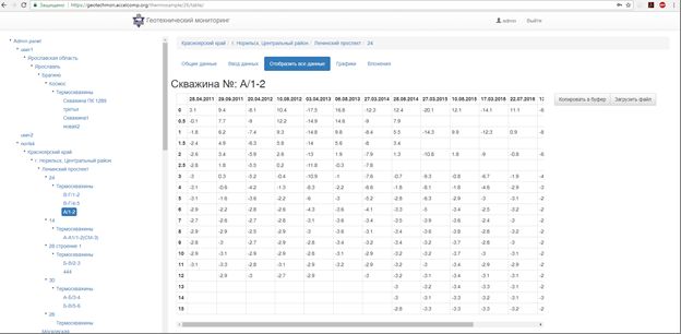 Вторым нашим шагом стало создание web версии программы Monitoring Information System (MIS), предназначенной для сбора, обработки и хранения данных геотехнического мониторинга на многолетнемерзлых грунтах. Решение приступить к такой разработке было более очевидным, чем с программой Permafrost 3D, так как на сегодняшней день подобные информационные базы данных становятся глобальными и не имеют привязки к конкретным стационарным компьютерам. Это позволяет создавать и хранить данные, внесенные разными пользователями, находящимися в совершенно разных точках Земли, причем одновременно и с моментальным обновлением (рис. 6, 7).