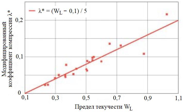 Рис. 3. Хорошая корреляция между модифицированным коэффициентом компрессии λ* и пределом текучести WL по результатам измерений Энгеля [8]
