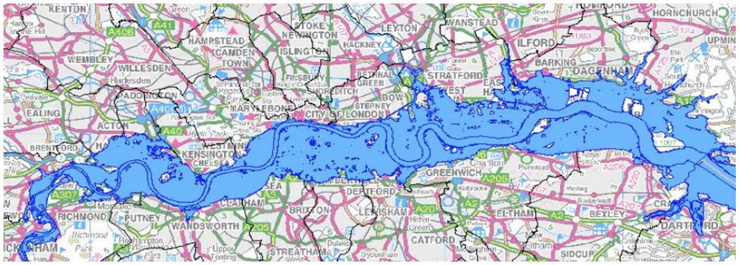 Рис. 2. Площади вдоль русла Темзы (показанные голубым цветом), которые затапливались в Лондоне и его окрестностях при сильных наводнениях до строительства на реке барьера для защиты от наводнений. Север на рисунке – сверху, как на любой карте [16]