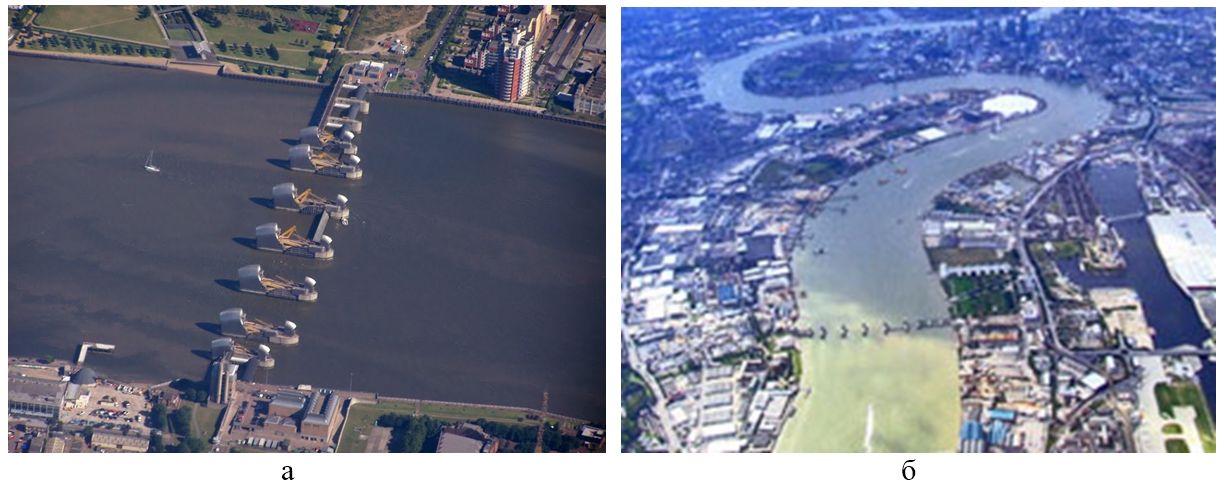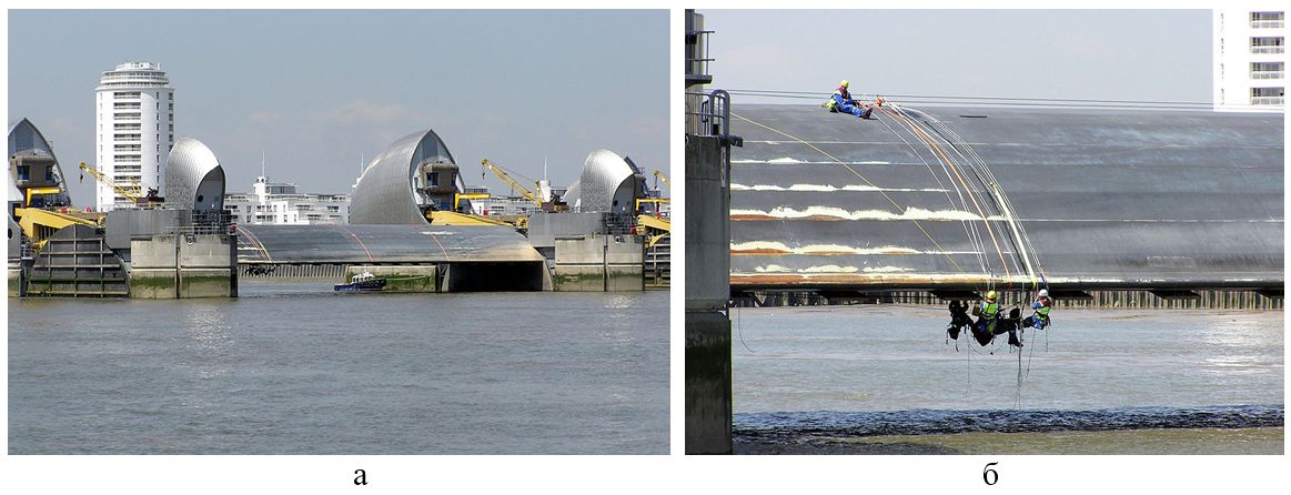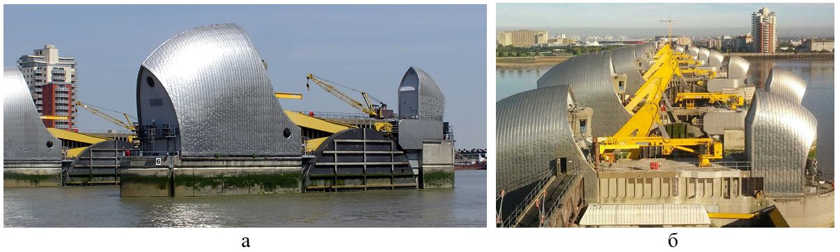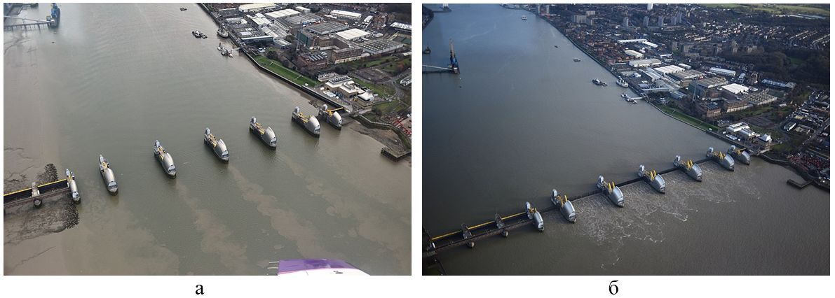 Рис. 9. Барьер Темзы с опущенными (а) и поднятыми (б) затворами [14]
