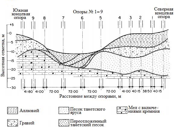 При этом не исключалась возможность наличия узких каналов в меле, но было решено, что в случае их обнаружения при строительстве котлованов под фундаменты опор будут предприняты необходимые корректирующие меры.