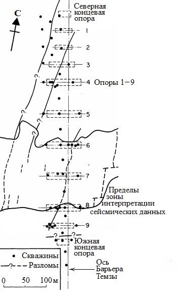 Рис. 6. Расположение инженерно-геологических скважин и разломов на участке строительства Барьера Темзы [12]
