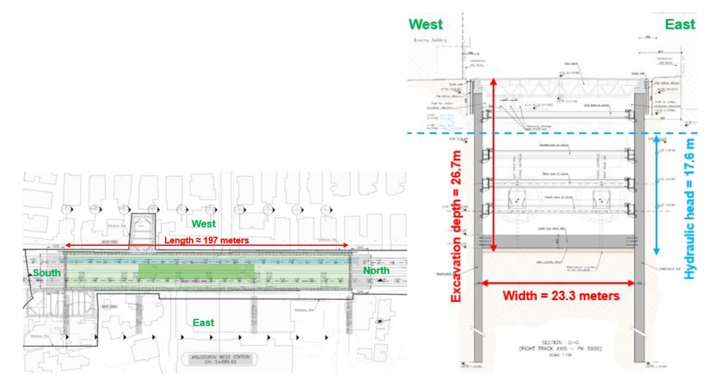 Станция Arlozorov West имеет размеры внешнего корпуса около 23×197 м при глубине около –27 м. Котлован будет вырыт по технологии cut and cover (букв. «разрезать и накрыть», это открытый способ проходки с устройством временных перекрытий), а постоянные конструкции станции будут строиться по технологии bottom-up («снизу вверх»). Стены в грунте достигают отметок –40 м над уровнем моря, а их толщина составляет 1,2/1,5 метра. В качестве несущей системы запроектированы четыре уровня стальных распорок: круглые полые профили диаметром 914/1219 мм и толщиной 16/25 мм с шагом 3/5 метра. Стандартное поперечное сечение дополнено временной бетонной плитой на уровне дна котлована (толщиной 200 см) и стальной ферменной конструкцией на уровне земли, выполняющей роль настила для обеспечения работоспособности городской дорожной сети во время строительных работ (рис. 1).
