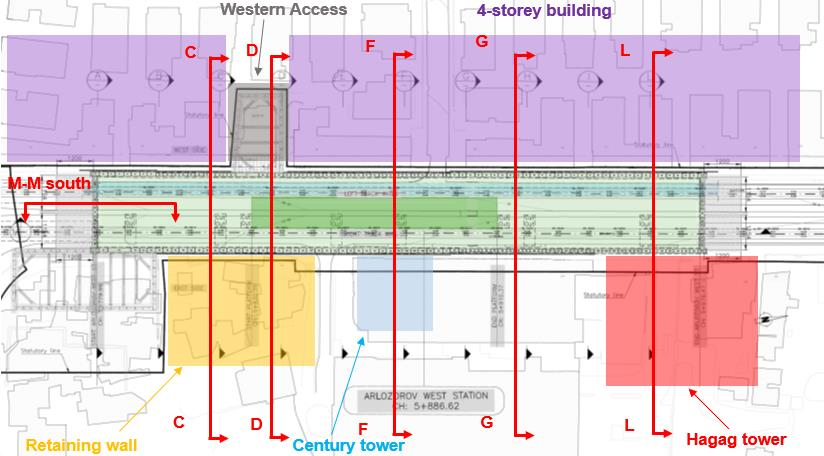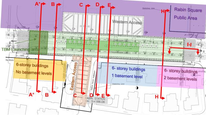 Представленный пример относится к участку A*-A*, который располагается в южной части станции. На восточной стороне находится шестиэтажное здание без подвальных этажей, а на западной стороне — площадь Ицхака Рабина – важное общественное место массового скопления людей.