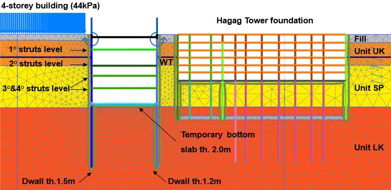 Далее представлен анализ участка L-L (см. рис. 2), расположенного между четырёхэтажными зданиями в западной части и будущей башней Хагаг (Hagag Tower) в восточной части. В настоящее время выполнены только земляные работы на подземных этажах башни и её фундаменте. Расстояние между будущей башней и станцией составляет 7,5 м, а фундамент здания достигает 7,4 м над уровнем моря (около 17,5 м от поверхности).
