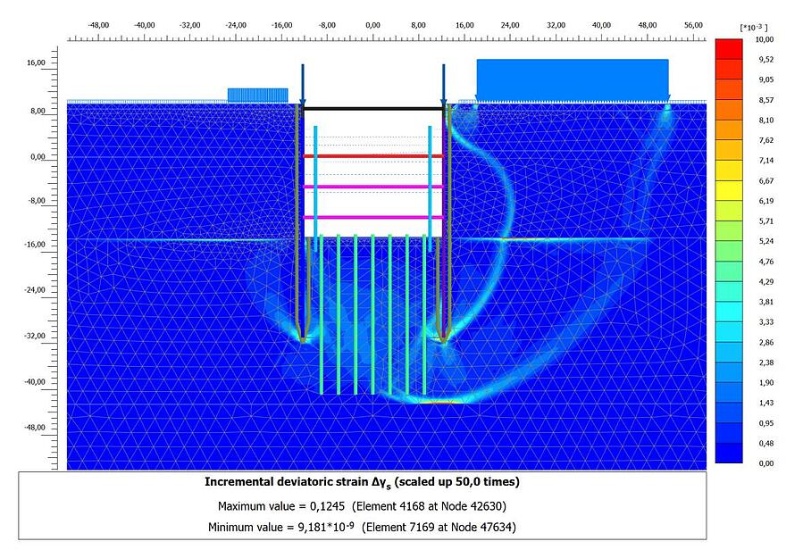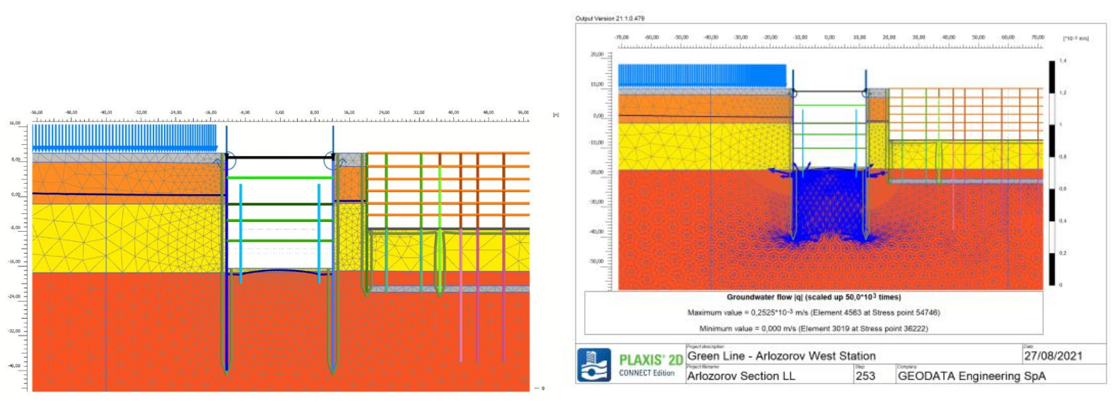 PLAXIS позволил команде выполнить геотехнический расчет и принять проектное решение. Например, команда могла анализировать осадки грунта, набухание глины и фильтрацию при водопонижении. В то же время на основании выполненных расчетов они смогли запроектировать железобетонные элементы (например, секции стен в грунте) и стальные элементы (например, стойки и ригели).