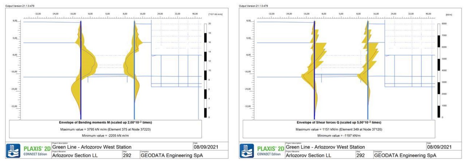 Рис. 5. Огибающие изгибающих моментов и поперечных сил в стенах в грунте на станции Arlozorov West
