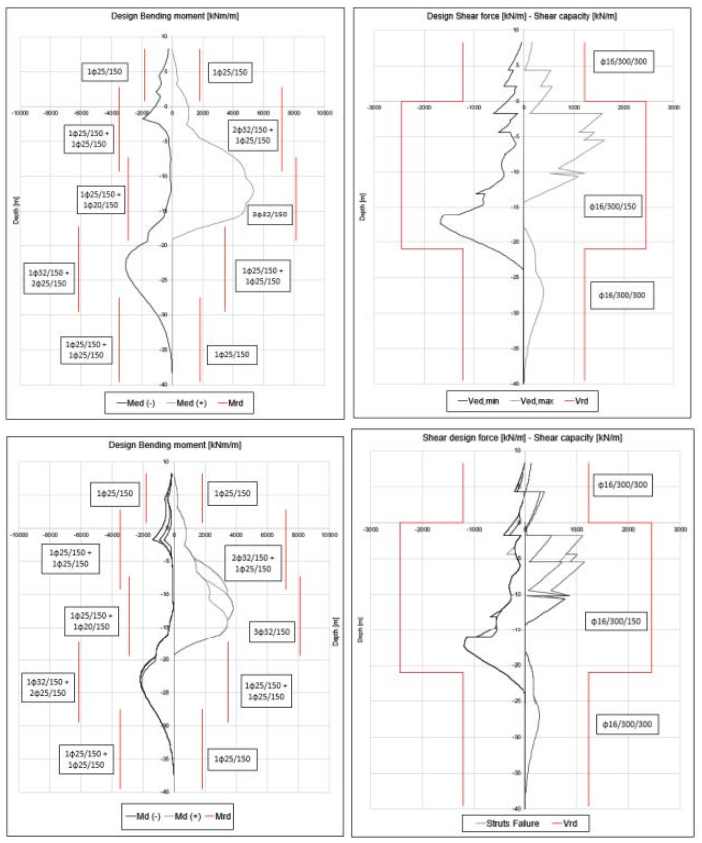 Созданная численная модель позволила команде рассчитать огибающие изгибающего момента и поперечных сил в стенах в грунте (рис. 5), на основании которых можно было выполнить проверку конструкции (рис. 6).