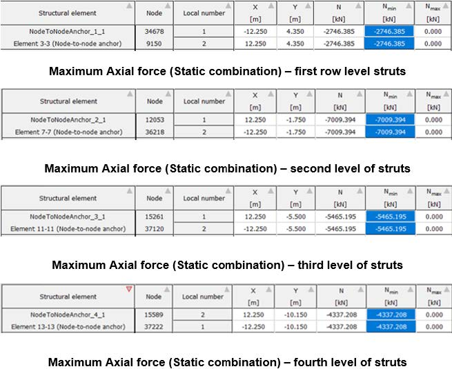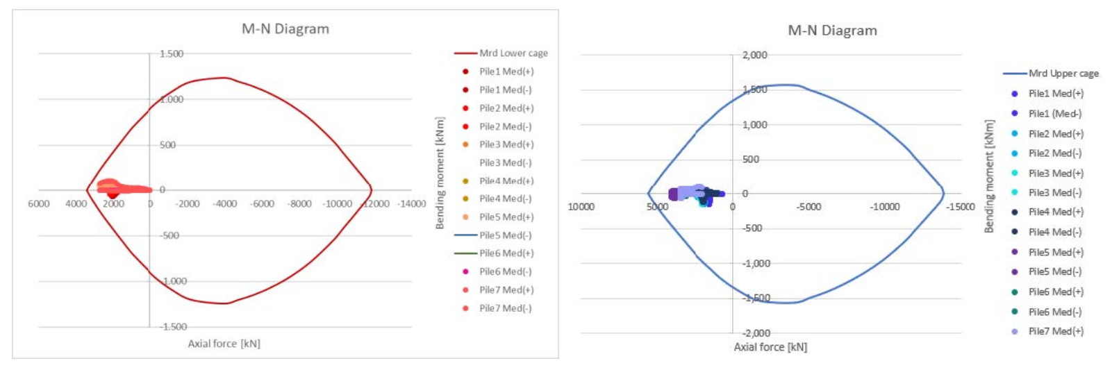 Анкерные сваи также были проверены, в т.ч. по прочности материала. На рисунке 14 показаны эпюры изгибающего момента, осевой и сдвигающей силы на этих элементах. Рисунок 15 иллюстрирует структурные проверки, полученные на основе результатов численной модели.