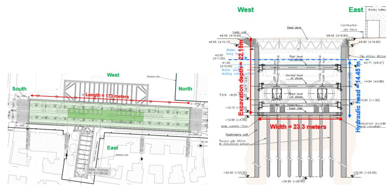 Станция Rabin имеет размер внешнего корпуса примерно 23×173 м при глубине около 22 м. Метод выемки грунта — cut and cover (см. выше), а внутренний корпус будет построен методом down-up. Стены в грунте в данном случае достигают глубины ?32 м над уровнем моря, а их толщина составляет 1,2 м на западной стороне и 1,5 м на восточной. На станции Rabin в качестве опорной системы предусмотрены три уровня стальных стоек: