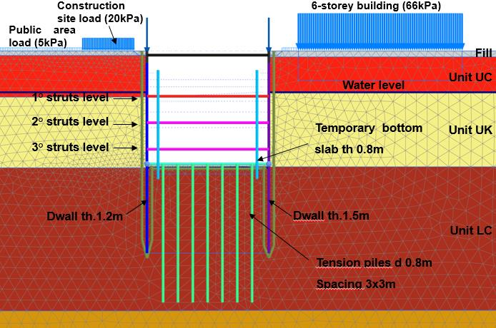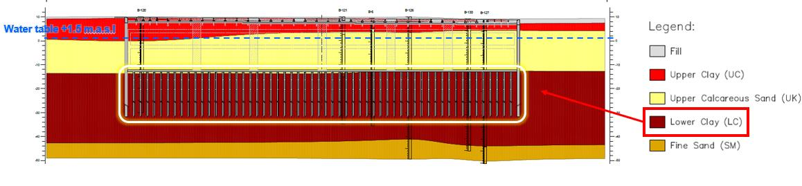 Геологические и гидрогеологические условия соответствуют результатам исследований, проведённых в данном районе: геология в основном характеризуется плотным и известняковым песком, а в расчётах была использована модель упрочняющегося грунта Hardening soil, обеспечивающая надёжные результаты в отношении деформаций. Уровень грунтовых вод в период строительства находится на отметке +1,5 м над уровнем моря, примерно на 9 м ниже уровня земли.