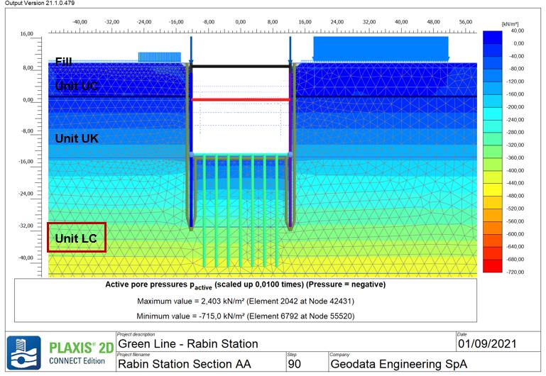Как и в случае со станцией Arlozorov West, система водопонижения задаётся с помощью вертикальных дренажных элементов в PLAXIS 2D, а уровень воды снова устанавливается на разных отметках в соответствии с фазами земляных работ. После установки бетонной временной плиты перекрытия система водопонижения отключается. Однако наличие глинистого слоя на дне котлована действует как «пробка» и создаёт избыточное поровое давление. По этой причине при проектировании была учтена консолидация. Для определения стадии, на которой необходимо было применить процесс консолидации, была проведена оценка времени консолидации. В связи с длительным временем консолидации расчёт проводился после того, как в численной модели было достигнуто конечное состояние котлована. На рисунке 12 показано распределение активного порового давления после этапа консолидации.