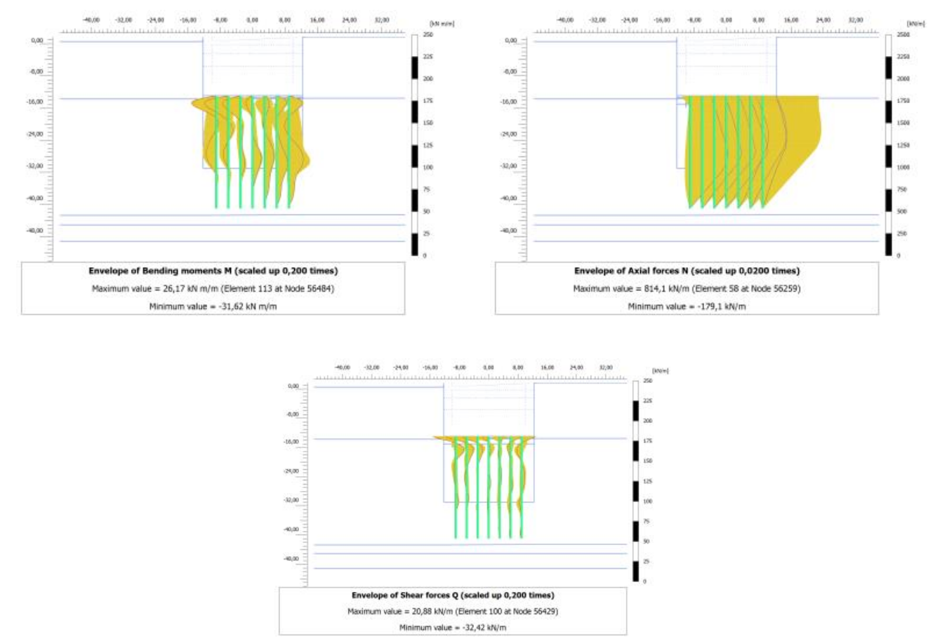 Рис. 14. Эпюры огибающих изгибающего момента, осевой силы и поперечной силы натяжных свай на станции Rabin