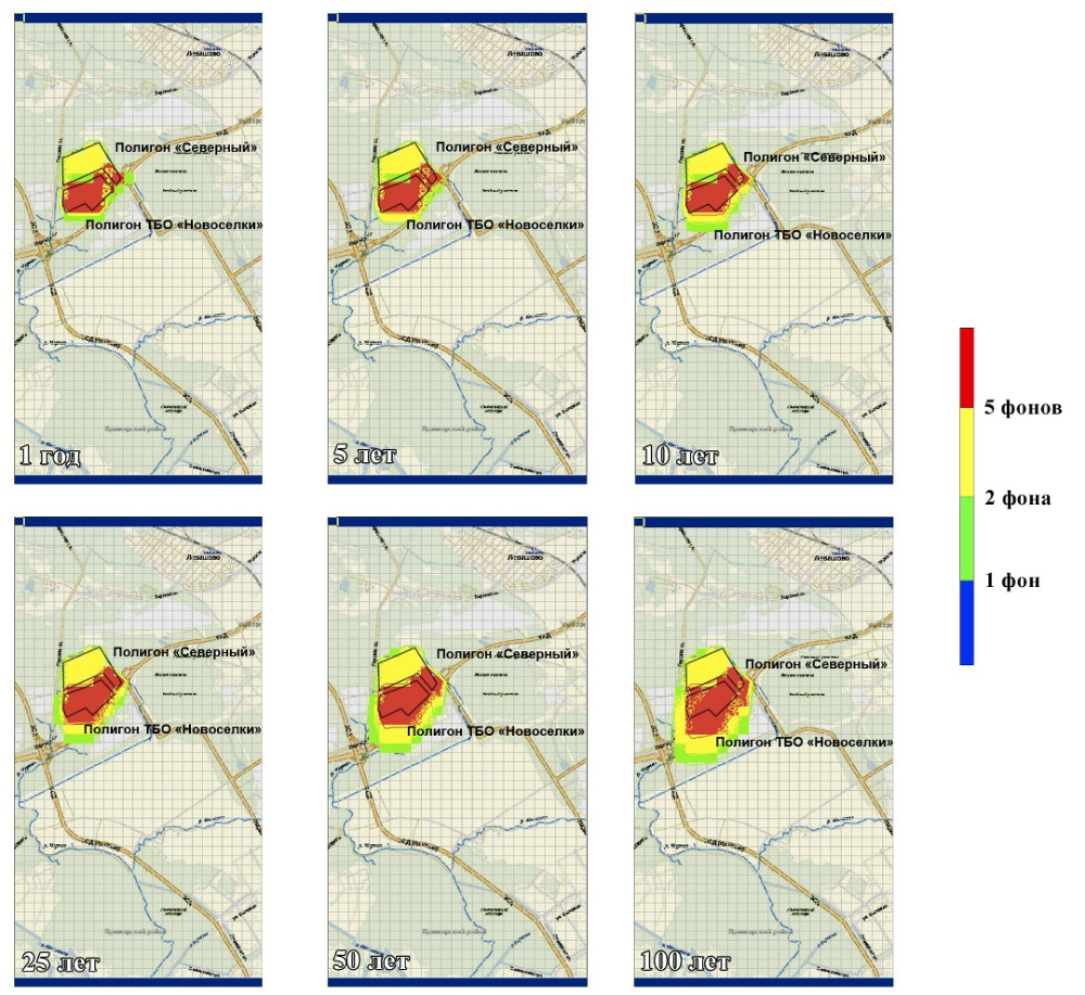 В прогнозе на 5-10 лет можно фиксировать увеличение ореола загрязнения на 100-200 метров в юго-западном направлении. При временном отрезке более 25 лет увеличение составляет 400-1000 метров. В северном направлении распространение антропогенной нагрузки не столь велико и не превышает 200 м, что обуславливается гидрогеологическими особенностями модели и наличием севернее иловых площадок заболоченных участков, способствующие аккумуляции в них некоторых тяжелых металлов и органических поллютантов.