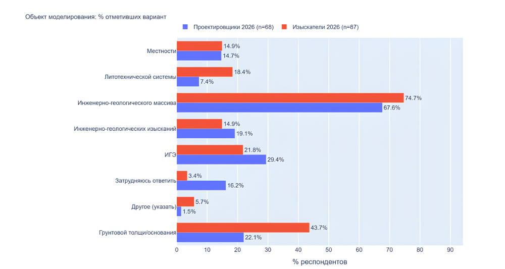 Признаемся, результаты опроса в части, касающейся объекта моделирования, оказались удивительными для нас самих. И с точки зрения проектировщиков и изыскателей самым популярным, причём с большим отрывом, оказался вариант «инженерно-геологический массив». Его выбрали 67,6% проектировщиков и 74,7% изыскателей. Показатели по другим вариантам заметно ниже: злополучная «местность» набирает около 15% у обоих групп респондентов, «грунтовая толща/основание» – 22,1% у проектировщиков и 43,7% у изыскателей, а частично дискредитировавший себя в контексте трехмерного информационного моделирования инженерно-геологический элемент , наоборот, оказался существенно более популярен у проектировщиков (43,7% против 22,1% у изыскателей). Вариант «литотехническая система», отсылающий к фундаментальным теоретическим основам инженерной геологии, набрал 18,4% у изыскателей и 7,4%у проектировщиков. Снимаем шляпу перед коллегами‑проектировщиками, которые сознательно используют этот термин в своей повседневной практике и при заполнении анкет. Ну и 14,9% изыскателей и 19.1% проектировщиков, считают, что объект моделирования – инженерно-геологические изыскания сами по себе (напрашивается вопрос, нужны ли изыскания ради изысканий).