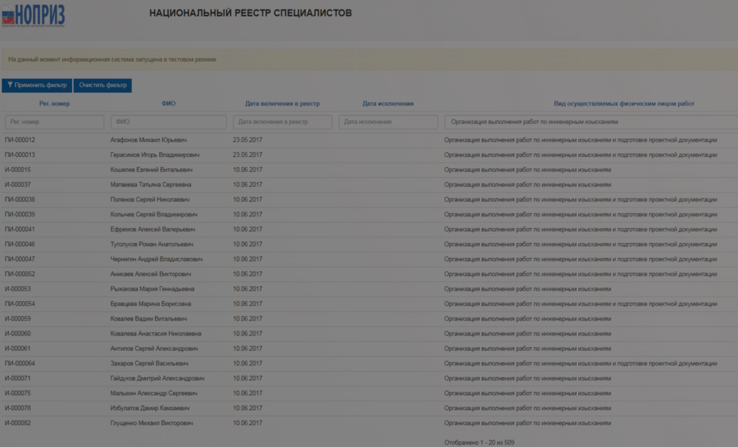 Сведения о таких специалистах включаются в Национальный реестр специалистов, который ведет Национальное объединение изыскателей и проектировщиков (НОПРИЗ). На момент ввода электронного реестра в эксплуатацию 30 июня 2017 года в него были внесены данные о 2689 специалистах по организации работ. Из них 244 - специалисты по организации инженерных изысканий. Прием заявлений на включение данных в реестр будет продолжен. Теперь, после вступления закона в силу саморегулируемые организации обязаны контролировать наличие у своих членов специалистов по организации работ, а также данные о наличии у них дипломов о профильном высшем образовании, соответствующего стажа работы и свидетельств о повышении квалификации.