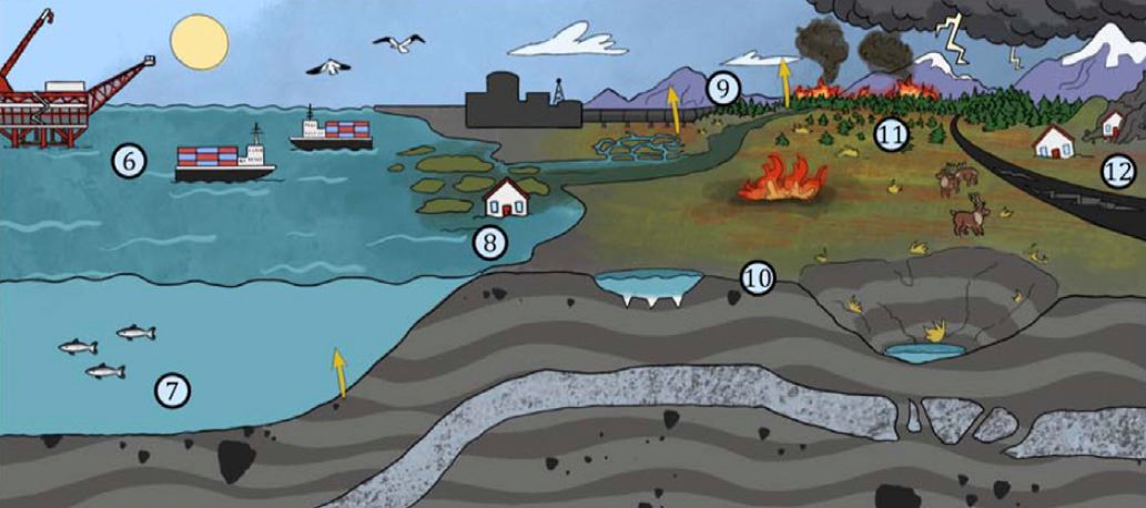 Криолитозона особенно уязвима к изменениям климата из-за ускоренного потепления на фоне широкого распространения льда. Температура воздуха в криолитозоне над сушей и морскими акваториями росла в 2–4 раза быстрее, чем в среднем по миру, что в значительной степени связано с таянием льда и снега, с изменениями в океанической и атмосферной циркуляции, а также с воздействиями озоноразрушающих газов [21–25]. Лед во всех его формах составляет фундамент и покров криолитозоны, и его потеря нарушает энергетический баланс, структуру экосистем и деятельность человека [26–31]. Поэтому изменения климата ведут к усилению динамики нарушений в криолитозоне и к перестройке социально-экологических процессов (отражающих взаимодействия между обществом и окружающей средой) в континентальном масштабе [32–35]. Во многих регионах эти изменения происходят на десятилетия быстрее, чем ожидалось [36–38], что, вероятно, предвещает к беспрецедентным биофизическим и социально-экологическим условиям в криолитозоне [39–42].