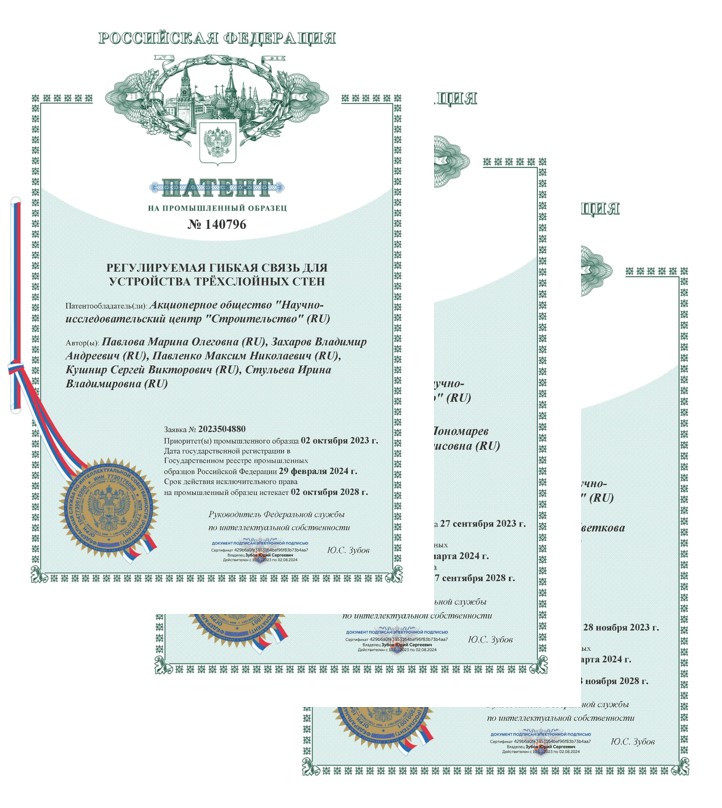 Патент № 140796 «Регулируемая гибкая связь для устройства трехслойных стен», авторы: Марина Павлова, Владимир Захаров, Максим Павленко, Сергей Кушнир, Ирина Стульева.