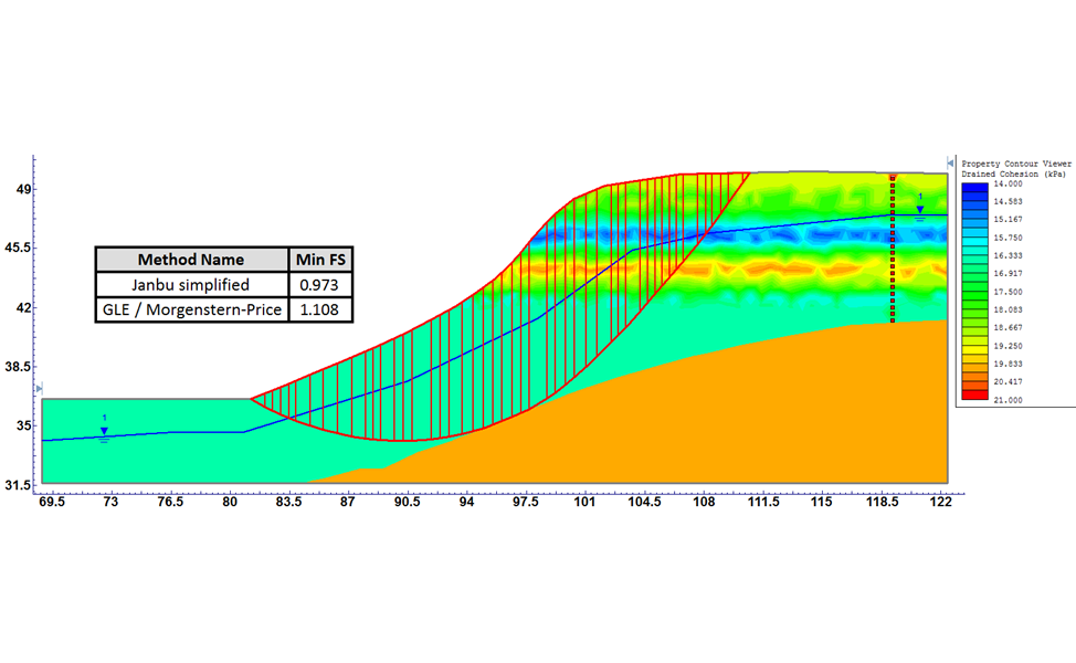 Результатом решения, как и в случае детерминированной модели, является определение минимального значения коэффициента устойчивости и нахождение положения соответствующей ему поверхности скольжения (рис. 4). Однако следует заметить, что результат зависит от выбора метода интерполяции свойств грунтов [5].