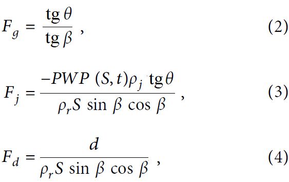 где θ – угол внутреннего трения грунта; β – угол наклона поверхности грунта; d – удельное сцепление грунта; ρr – удельный вес грунта, средневзвешенный по глубине; ρj – удельный вес грунтовых вод; PWP(S,t) –функция порового давления воды, изменяющаяся во времени и пространстве и связанная с гидростатическим напором, которая является быстро корректирующим коэффициентом в уравнении (3).