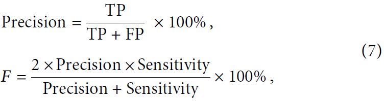 где Precision – точность положительного класса, то есть доля правильно предсказанных положительных результатов среди всех случаев, которые модель определила как положительные; TP (true positive) – количество истинно положительных ответов, которые в действительности положительные и которые модель правильно определила как положительные; FP (false positive) – количество ложноположительных ответов, которые в действительности отрицательные, но модель ошибочно определила их как положительные; F – F-мера, служащая для оценки качества классификации (в данном случае того, насколько правильно модель или система интерпретирует данные датчиков, то есть каков общий уровень корректности и полноты оценки данных сенсорной системы); Sensitivity – чувствительность (см. формулу (6)).