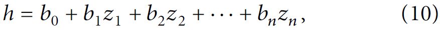 где n – общее число факторов; b0 — интерсепт модели (то есть свободный член – значение зависимой переменной, которое наблюдается при нулевых значениях всех независимых переменных. – Ред.); bi, где i = 1, 2, …, n, – регрессионные коэффициенты; zi, где i = 1, 2, …, n, – значения/признаки факторов.