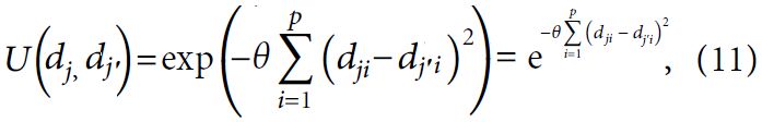 где dji, dji – j-я пара наблюдений для i-го предиктора (значения, признака); p – число предикторов (значений, признаков); θ – параметр настройки, учитывающий гладкость/плавность границы решения; U – функция ядра.