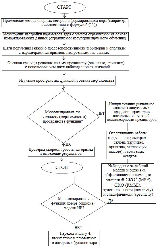 Рис. 2. Предлагаемая блок-схема применения метода опорных векторов для обнаружения оползней с использованием функций ядра. Расшифровка аббревиатур: ИИ – искусственный интеллект; СКО – среднеквадратическое отклонение (в английской версии – RMSE, Root Mean Squared Error – корень из среднеквадратической ошибки); (СКО)2 – квадрат среднеквадратического отклонения, или дисперсия (в английской версии – MSE, Mean Squared Error – среднеквадратическая ошибка)