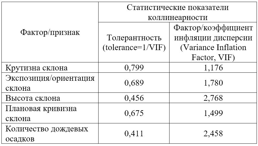 Таблица 1. Результаты диагностики мультиколлинеарности факторов, влияющих на возникновение оползней