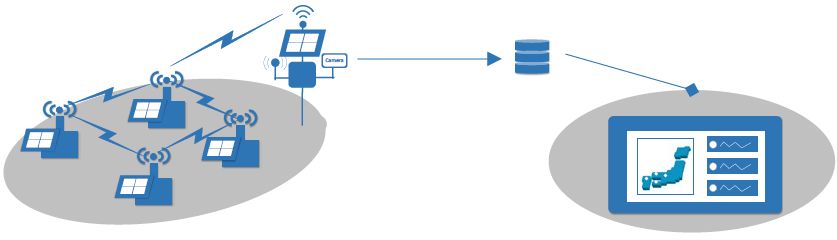 Мониторинг был начат в ноябре 2017 года. Его данные отправлялись на веб-сервер каждые 10 минут через «интернет вещей» (компьютерную сеть, объединяющую все используемые при мониторинге устройства) с использованием технологии беспроводной сенсорной сети, как показано на рисунке 3. Сенсорные узлы, которые работали от солнечного источника электропитания, могли взаимодействовать друг с другом через беспроводную сенсорную сеть в прерывистом режиме. В представленном в данной статье исследовании авторы проанализировали результаты мониторинга в точке А (см. рис. 2) во время сильных дождей в июле 2018 года.