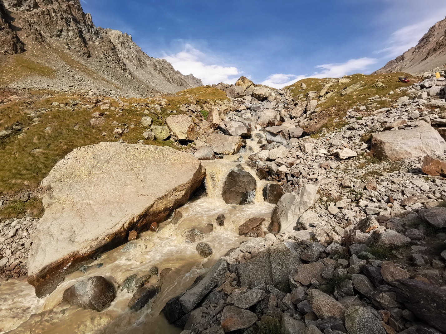 Коллювиальный литотоп, формирующий транзитно-аккумулятивную ЭГС, здесь является преобладающим и представлен осыпными крупнообломочными грунтами (QIV), состоящими из неокатанных угловатых обломков материнских магматических пород (гранитов гС) и метаморфических пород протерозоя (PR) – гнейсов, амфиболитов и др. размером от 2-5 см до глыб размером 80-120 см и более. В основном в осыпях преобладают обломки размером 10-15 см. Осыпи активные, не стабилизированные, формируются вследствие развития процессов физического выветривания и активизируются под влиянием сезонных климатических факторов и сейсмических воздействий (рис. 2, 4-6).