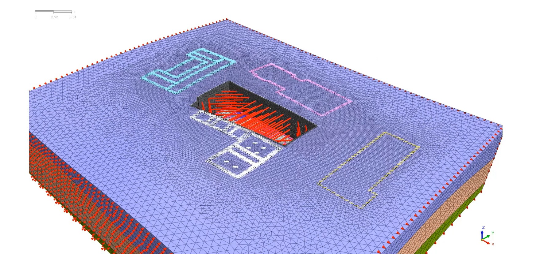 В зависимости от типа котлована, его глубины и сложности геологической ситуации, конструкция оградительной системы котлована может быть достаточно сложной. При расчёте таких систем требуется точное описание грунта и конструкций, а также возможность комплексного анализа работы системы «грунт-сооружение» с учётом этапов производства работ.